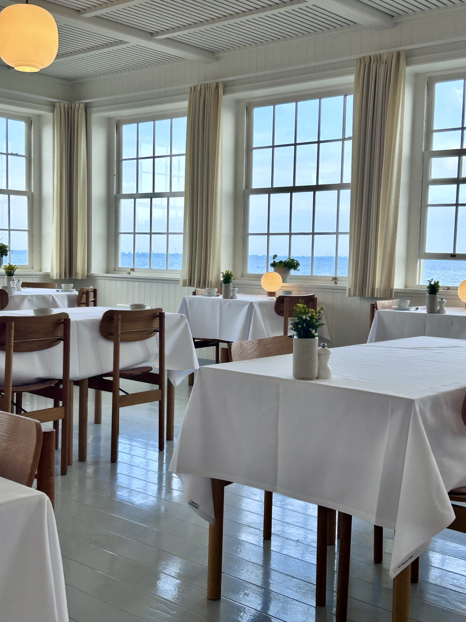 Svinkløv Badehotel is a historic Danish coastal hotel, hidden away behind the dunes where it has stood since 1925. The original hotel was destroyed by fire in 2015, but it has been rebuilt by its current owners staying true to its original style in every way. It is impossible to book a room at the hotel. There is a long waiting list, and if you do manage to succeed, you will be offered first refusal on the same room on the same date the following year. Svinkløv prides itself on complete tranquillity and relaxation. There is no Wi-Fi in the hotel, limited mobile phone reception, and no televisions, to ensure that guests switch off. The interior is based on a traditional Danish summerhouse design, and is understated and high-end, maximizing the natural light with huge windows out to the sea, and drawing inspiration from the coastal colors of the landscape outside. You will find whitewashed wooden floors, pristine white linen table covers, chairs designed by Fritz Hansen, and table lamps from Le Klint. The food is exquisite in both taste and presentation. You immediately know what to expect when you walk past the patisserie counter as you enter the dining room, where the handmade patisserie works of art look too perfect to eat!